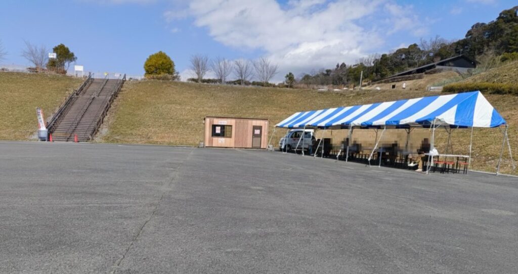⇧駐車場横の会場にはテント設営して休憩所もあります。こちらでは飲食可能です。(梅林公園は飲食禁止と看板がありました)